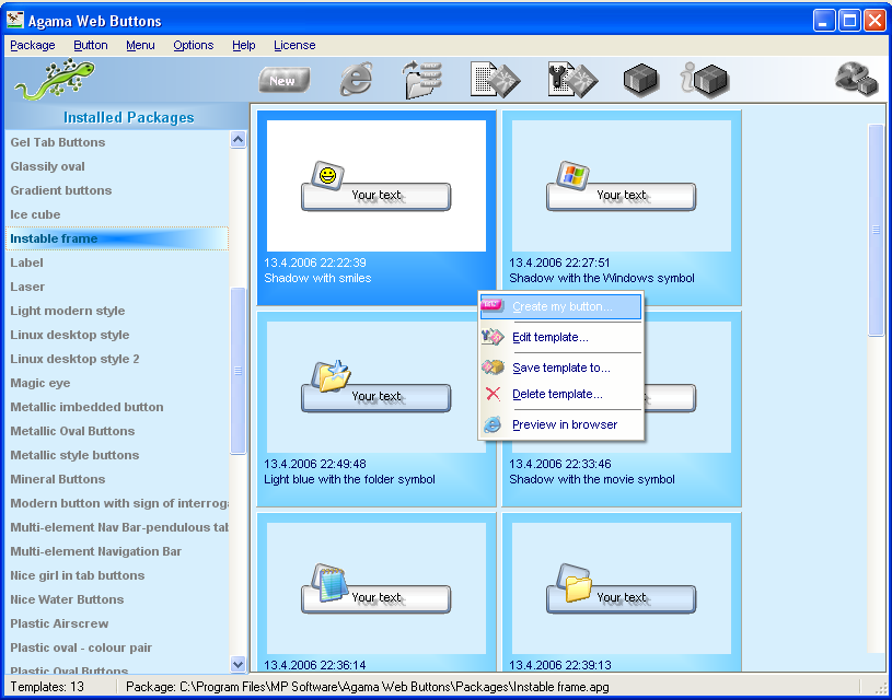 金屬、塑膠甚至XP樣式的web按鈕。 基本安裝包括25個包共150個按鈕範本供你選用。